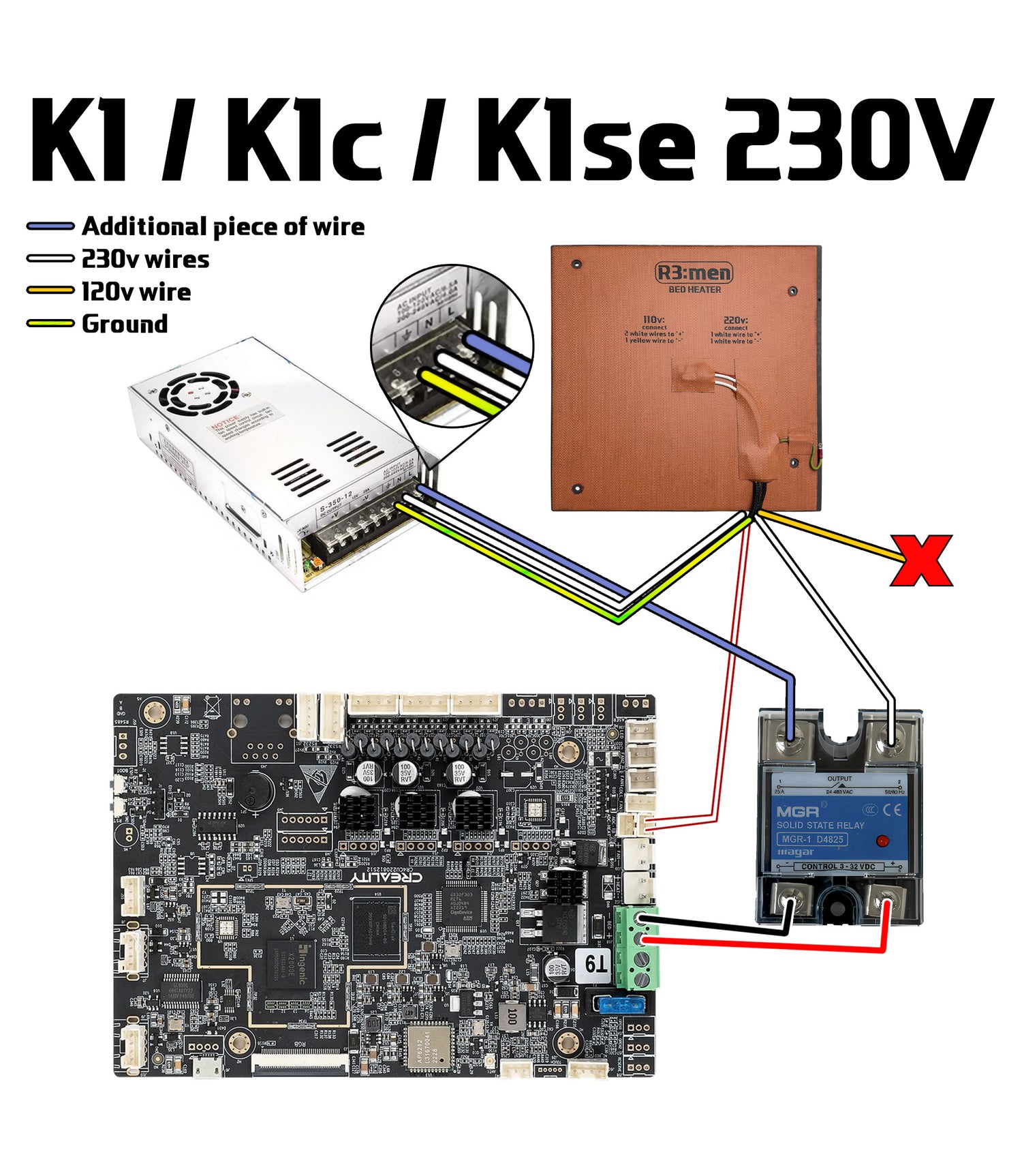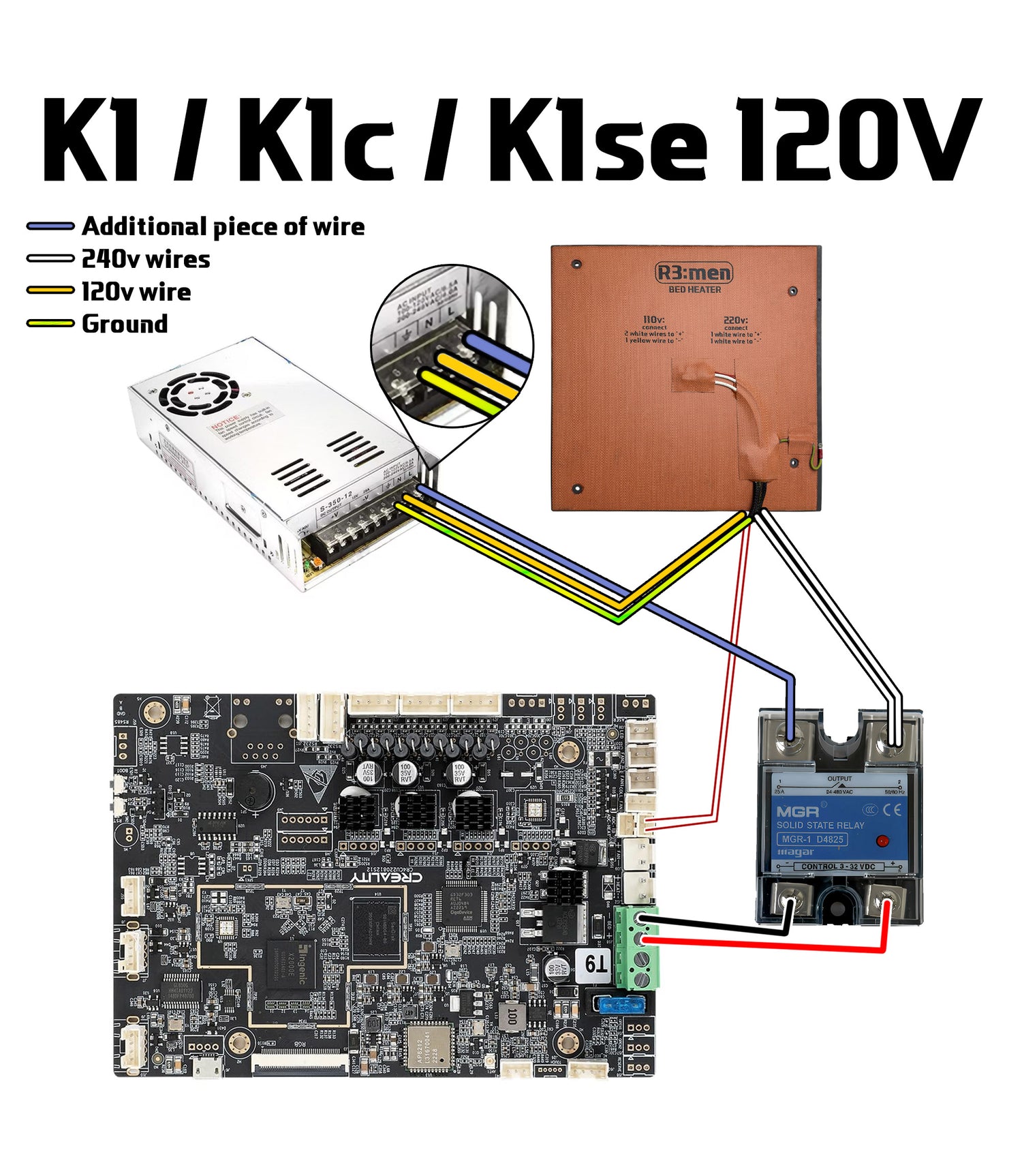 1. Connect 1 yellow wire (120v wire with fork terminal) to PSU N slot. Connect 2 white wires together to SSR Output 2 slot. Use a piece of wire to connect the PSU L slot with the SSR Output 1 slot. Connect the SSR Control side (bottom DC slots) with the main board. Do not confuse + and - as this is DC. Connect the yellow and green grounding wire (grounding wire has a ring terminal) with PSU grounding slot.